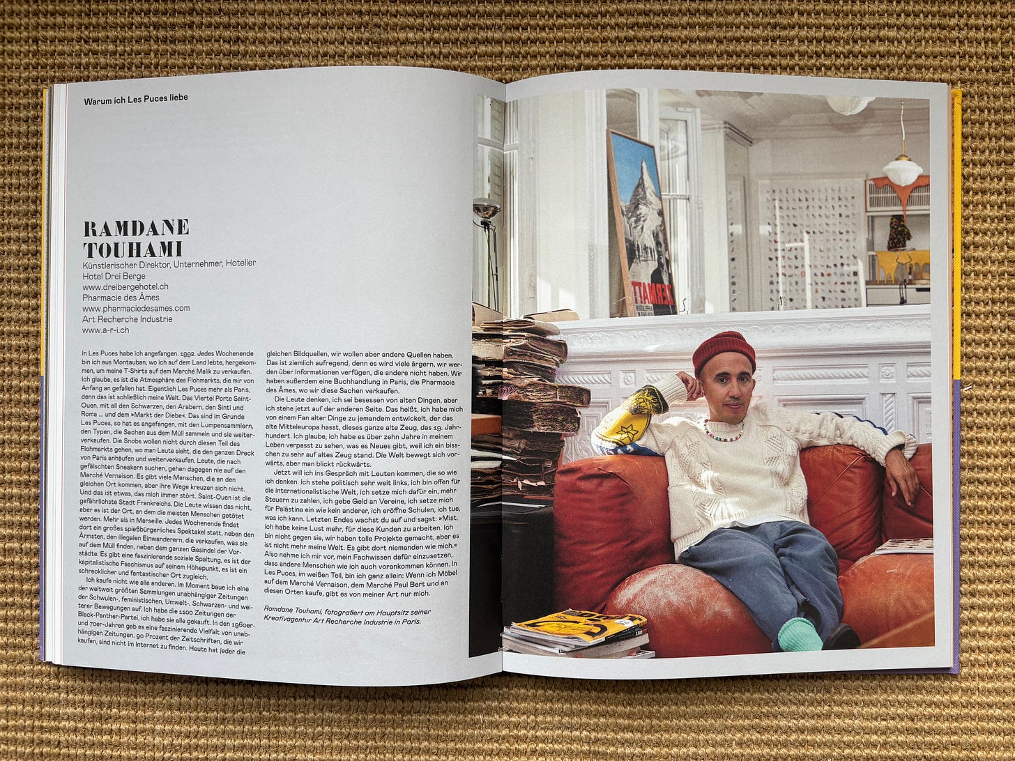 Our very own Renaissance man, Ramdane Touhami, started out at the Puces de Saint-Ouen back in 1992, coming up every weekend from his native Montauban to sell his own collection of T-shirts at the Marché Malik, naturally drawn to the hustle and energy of the market and resonating with its contradictions – straddling as it does rich and poor, old and new, real and fake, French heritage and cosmopolitan melting pot. From those humble beginnings, Ramdane has built an extraordinary career, with one of his most recent achievements being the sale of Officine Universelle Buly, which he created with his wife Victoire de Taillac, to LVMH. Today, via his creative agency Art Recherche Industrie, “branding is elevated to the level of total art” for clients including Gucci, Zara and Christofle. Touhami has inspired a young generation of entrepreneurs to prioritize craft over efficiency, authenticity over trends and cultural specificity over global uniformity. Restless, ambitious, endlessly curious, he moves effortlessly across fashion, design, publishing and retail, always combining craft, politics and beauty. When he’s in Paris, you can be sure he’ll be back at the Puces, hunting for whatever feeds his current obsession.