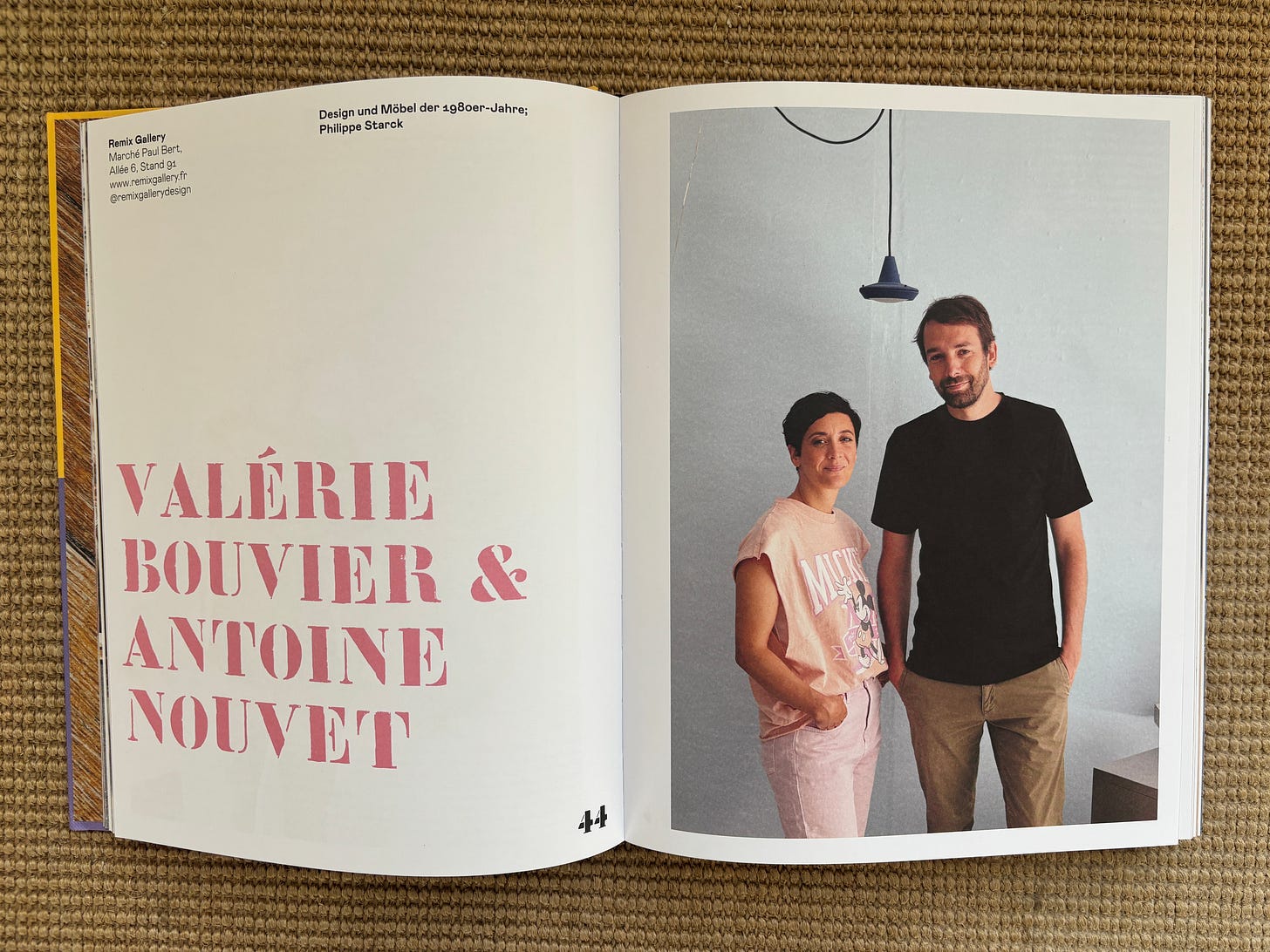 A duo in life and work, Valérie Bouvier and Antoine Nouvet have been at the helm of Remix Gallery at the Marché Paul-Bert since 2015, among the first dealers at the Puces to champion 1980s design and contribute to its wider reappraisal. Their stand reflects a shared sensibility shaped by that decade’s visual culture – bold, inventive and irreverent – alongside a deep knowledge of its key figures, in France and beyond, from Philippe Starck and Andrée Putman to Alessandro Mendini. Regularly reconfigured, their display evolves with each visit, guided as much by instinct as by research, and rooted in a practice of chiner they describe, above all, as a game. Their story mirrors a broader shift at the Puces, where twentieth-century design has come to the fore, in line with evolving tastes, gradually overtaking period furniture and decorative arts, once the lifeblood of the market. Their activity extends beyond the Puces, with Remix regularly curating themed exhibitions in central Paris and participating in major design fairs such as the PAD.